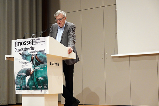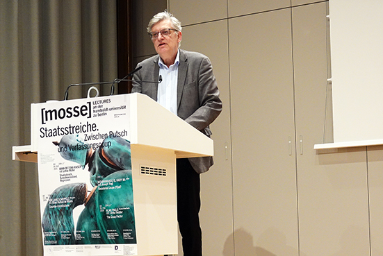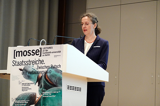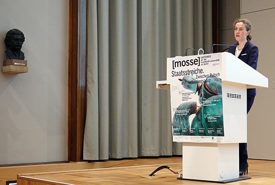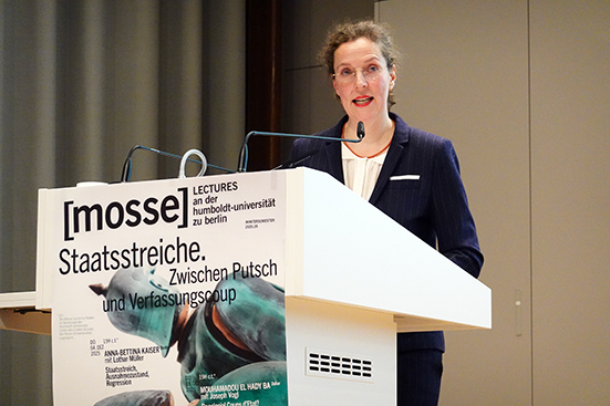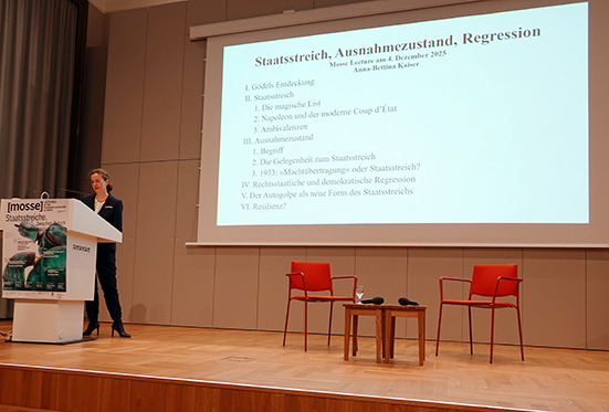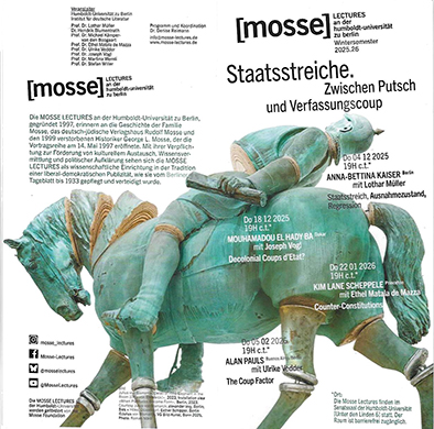 Im Gespräch mit Lothar Müller nach ihrer Mosse-Lecture im Senatssaal der Humboldt-Universität über die Wahrnehmung der politischen Aktualität in den Rechtsinstituten an den führenden Universitäten in den USA gefragt, kommt Anna-Bettina Kaiser auf den Punkt: man müsse, was in Washington passiere, beim Namen nennen: es handele sich um einen Staatsstreich. – Staatsstreiche. Zwischen Putsch und Verfassungscoup sind das Semesterthema der 4 Mosse-Lectures im Wintersemester 2025/26. Welche Narrative werden für einen Staatsstreich bemüht? Anna-Bettina Kaiser ist als Fulbright-Stipendiatin und Senior Emile Noël Global Fellow an der New York University gut vernetzt. Sie lehrt Öffentliches Recht und Grundlagen des Rechts an der Humboldt-Universität.