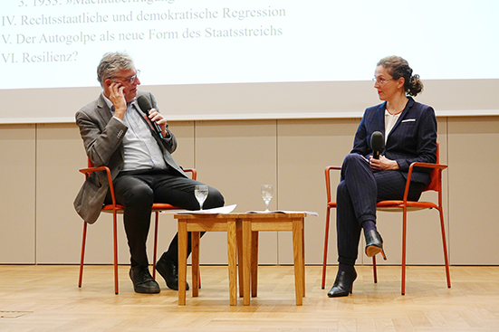 Die Gefahren für die Verfassung oder eben das Grundgesetz der Bundesrepublik Deutschland wachsen in dem Maße, wie sie verdrängt oder gar geleugnet werden. Deshalb ist Kaiser seit 2016 Teil des Projekts „Constitutionalism under Stress“ (CONSTRESS) und seit 2019 Co-Direktorin am Integrative Research Institute Law & Society der Humboldt Universität. Die wissenschaftliche Benennung der Gefahren wie Staatstreich, Ausnahmezustand und rechtsstaatliche Regression kann nicht nur zu einem bewussteren Umgang mit der demokratischen Grundordnung führen, vielmehr wird im anschließenden Gespräch mit Lothar Müller und den Zuhörer*innen deutlich, dass sie eine Sensibilität für die Gefahren erzeugt. Staatsstreiche, Ausnahmezustände, rechtsstaatliche Regression passieren nicht immer woanders, sondern müssen auch für das Grundgesetz als Gefahr wahrgenommen werden, um sie zu verhindern.