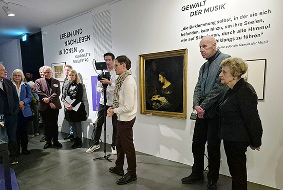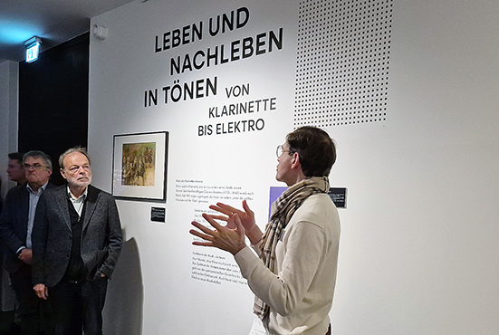 Der Kurator der Ausstellung wie auch Organisator der Tagung Dr. Adrian Schliebe ist selbst ein beeindruckender Musiker am Klavier. Damit verfügt er über ein Musikwissen, das für Ausstellung und Tagung eine Rolle spielte. Die Militärmusik um 1800, sofern sie nicht in Notenschriften erhalten wurde, ist flüchtig. Die zu Signalen transformierten Töne und die synchronisierenden Marschmusiken dürften ein Teil der Lebenswirklichkeit des jungen Heinrich gewesen sein. Er wird einerseits als Empfänger die befehlsförmigen Signale und Märsche gehört haben. Anderseits könnte der Fähnrich Kleist selbst als Klarinettist in die Befehlsstrukturen der Militärmusik eingebunden gewesen sein. Um 1800 wird die Klarinette durch Kompositionen von Wolfgang Amadeus Mozart zum virtuosen Musikinstrument. Neben den Texten zur Musik, Briefreflexionen über sie, Musikalität von Texten und Texte zur Musik sind es Musikkomposition von Texten Kleists, die in der Ausstellung und während der Tagung diskutiert wurden.