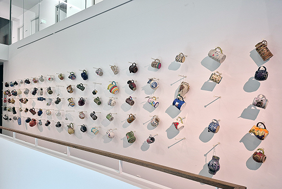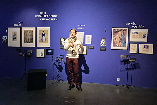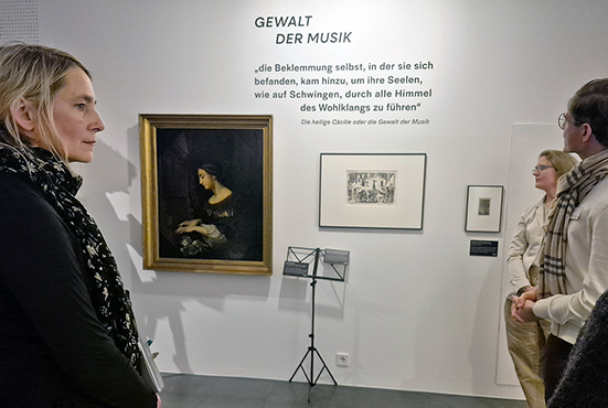 Mit dem Ausstellungstitel Zerbrochne Harmonien spielt Schliebe bereits auf Kleists Lustspiel Der zerbrochne Krug an. Zerbrochene Krüge werden denn auch materiell und visuell zu einer Signatur der Ausstellung. Als hätten die Frankfurter*innen dutzende von mehr oder weniger zerbrochenen Krügen zur Ausstellung beigesteuert, werden sie aufgereiht und aufgehängt. Kleists Schreibweise – „zerbrochne“ – ließe sich als ein Bruch in der Orthografie lesen. Schließlich werden in der Ausstellung DREI HERAUSRAGENDE KRUG-OPERN von Fritz Geißler (1968), Viktor Ullmann (1942) und Zbynèk Vostřák (Rozbitý džbán 1960/61) präsentiert. Doch zunächst geht es in der Ausstellung um die GEWALT DER MUSIK und damit um Darstellungen von Heinrich von Kleists Legende Die heilige Cäcilie aus den Berliner Abendblättern.