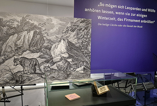 Die Ausstellung Zerbrochne Harmonien stellt ein Netz aus Texten von der und über die Musik bei Kleist her. Zum Brief an Adolphine von Werdeck mit der Erwähnung der „Flöte“ wird eine historische Flöte aus der Sammlung des Museums Viadrina, dem Stadtmuseum von Frankfurt, gezeigt, wie sie um 1800 konstruiert worden sei. Die Heilige Cäcilie oder die Gewalt der Musik wird mit verschiedenen Darstellungen und der Vorstellung heulender Wölfe in Texten zur Natur um 1800 konstelliert, weil die vier Brüder nach dem vereitelten Bildersturm jede Nacht das „gloria in excelsis“ singen. Nach der erweiterten Fassung der „Legende“ aus den Berliner Abendblättern von 1810 heißt es in den Erzählungen, „mit einer entsetzlichen und gräßlichen Stimme, das gloria in excelsis zu intoniren“ begannen. „So mögen sich Leoparden und Wölfe anhören lassen, wenn sie zur eisigen Winterzeit, das Firmament anbrüllen:…“[12] Dass Kleist den Text schon in den Berliner Abendblättern eine „Legende“ nannte und in beiden Schlussformulierungen wiederum die „Legende“ als Erzählgenre benennt, wird nicht erwähnt.[13]