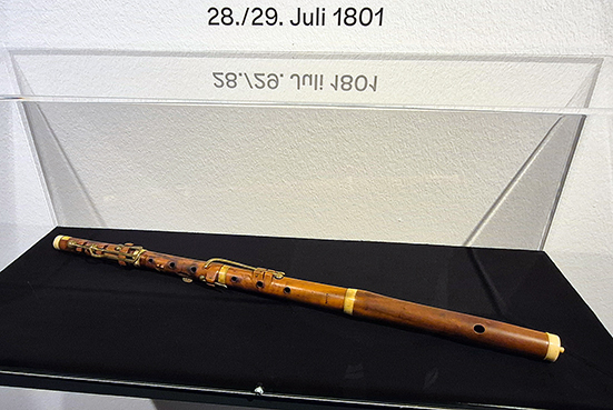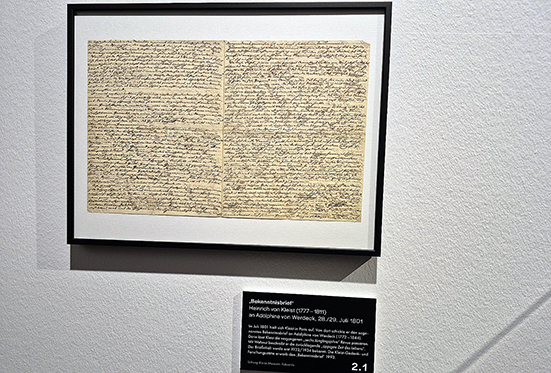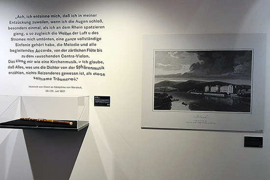 In der Ausstellung wird das Faksimile von Kleists eng beschriebenem Brief an Adolphine von Werdeck vom 28./29. Juli 1801 aus Paris gezeigt, in dem Musik für den 23jährigen wiederholt eine Rolle spielt. Einerseits bezeichnet er sich selbst als ein „vorher todtes Instrument“, das durch das „Gehör“ während seiner Stationierung als 16jähriger in Mainz zum Leben erweckt wurde. Andererseits wird ihm das dortige Naturerlebnis am Rhein zu einer „Sinfonie“: