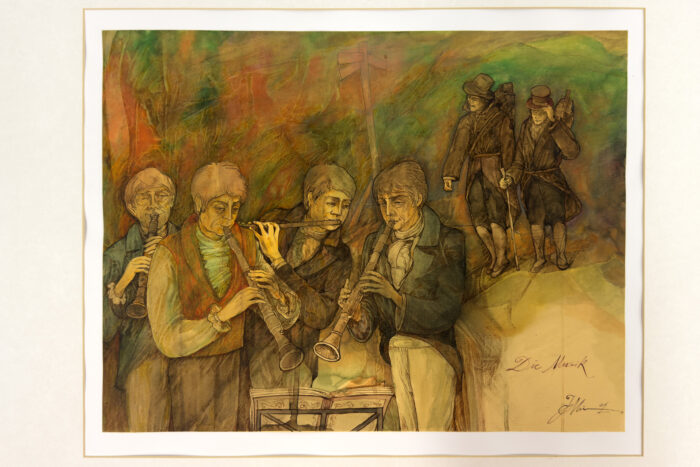 Heinrich von Kleist trat im Alter von 14 Jahren in das Königlich-Preußische Infanterie-Regiment Nr. 15 (Regiment Garde) ein und lernte die Klarinette als Musikinstrument im Militär kennen. Er blieb 7 Jahre im Militärdienst, wie es üblich war. Der junge Heinrich hatte somit genug Zeit, um die Klarinette im herausragenden Regiment in Potsdam zu hören und spielen zu lernen. Wann er selbst begann, die Klarinette zu spielen, ist nicht überliefert. Im die Sonderausstellung eröffnenden Aquarell mit dem in Zivil Klarinette spielenden Heinrich und seinen Freunden imaginiert ihn Jon Mincu als Musiker. Im Regiment hatte die Klarinette die Aufgabe, Signale zu geben und im Marsch die Melodie zu spielen.