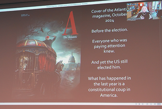 Ist die Verfassung der Vereinigten Staaten von Amerika zu schwach, um sich gegen Trump wehren zu können? Die höchstrichterliche Rechtsprechung des Supreme Courts und die Elastizität der Verfassung nach angelsächsischer Rechtstradition unterscheidet sich von dem positiven Recht der deutschen Rechtstradition. Schepple argumentiert, dass die „counter-constitution“ mit einer Vision des „small state“ vor 50 Jahren von den Konservativen initiiert worden sei. Deshalb könne er sich auf eine jahrzehntealte Infrastruktur stützen und den Wegen ausländischer Autokraten folgen. Für die Verfassungsänderung könne er sich auf mehrheitlich konservative Entscheidungen des Surpreme Courts verlassen. Kim Schepple zeichnet ein durchaus pessimistisches Bild, dass die Gegen-Verfassung gelingen könnte. Doch es geht damit nicht (nur) um die Verfassung der USA, vielmehr hat sich die Gegen-Verfassung der Konservativen längst die Vereinten Nationen und Europa zum Ziel genommen und schlägt damit in die gleiche Kerbe wie Vladimir Putins Begründung des Angriffskrieges gegen die Ukraine.[9] Er nannte 2022 die „Bedrohung des Westens“ als Kriegsgrund und zielte insbesondere auf die Europäische Union und ihre Verfassung.