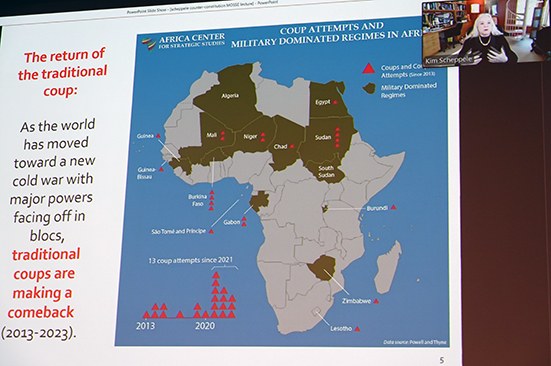 In ihrer Analyse weist Kim Schepple eröffnend u. a. daraufhin, dass zwischen 2013 und 2023 der traditionelle Coup als Putsch in Afrika als Folge eines neuen Kalten Krieges (a new cold war) zurückgekehrt sei. Seit 1991 seien allerdings die legalen Staatsstreiche durch Wahlen häufiger geworden. Dadurch werde eine demokratische Fassade gewahrt. Unmittelbar nach seiner Inauguration am 20. Januar 2025 habe Trump ein derartiges Chaos geschaffen, dass das Normale einfach verschwand. Trotzdem versuchten wir weiterhin einen Sinn herauszufinden, konstatiert Schepple. Anders gesagt: das Chaos auf sämtlichen politischen Ebenen ist Programm, was u.a. der deutsche Bundeskanzler, Friedrich Merz hätte wissen müssen und wissen können, als er sich die Schenkel im Oval Office klopfen ließ und eine zustimmende Miene aufsetzte. Es geht im Krieg gegen den Iran keinesfalls darum, ein demokratisches System zu fördern oder zu installieren. Stattdessen schrauben Trump und seine Adepten Drehung für Drehung weiter am Chaos in der Welt. Auf steigende Ölpreise folgt die Lockerung der Sanktionen gegen Lieferungen von russischem Öl auf dem Weltmarkt. Nichtsdestotrotz folge Trump einem Drehbuch, das durch Chaos regionale und globale Regel außer Kraft setzt.