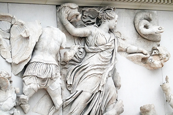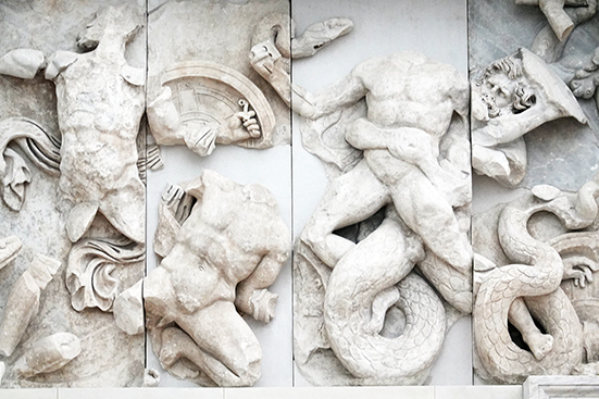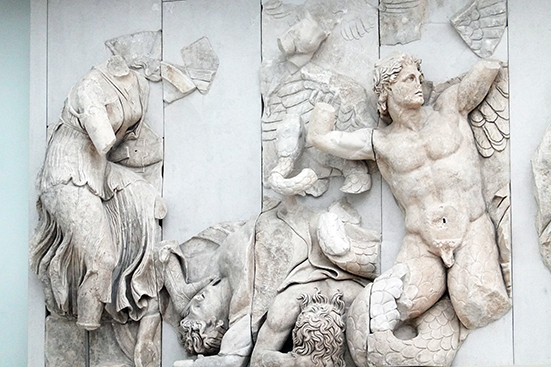 Das rekonstruierte, bruchstückhafte Fries der Gigantomachie ist nun gereinigt und überarbeitet worden. Die sterblichen Giganten rebellieren gegen die Götter unter der Leitung des Göttervaters Zeus. Sie sind nach Apollodor irdische, übergroße Mischwesen mit „Schuppenfüße(n) von Drachen“. Bei der Rekonstruktion des Frieses hielten sich die Wissenschaftler an den Text Apollodors. Auffällig an der Gigantomachie ist die irdische Herkunft des Geschlechts, das es wagt, eindrucksvoll gegen die Götter zu rebellieren, um letztlich doch von ihnen besiegt und vertrieben zu werden. Die Verkettung der Namen von Göttern und sterblichen Giganten funktioniert als Legitimation irdischer Herrschaft an unterschiedlichen Orten: