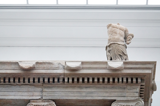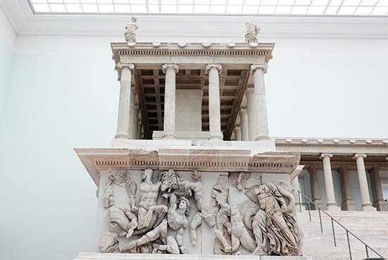 Das Pergamonmuseum mit seinem namengebenden späthellenistischen Altar sollte nach 1900 gegenüber dem Alten Museum aus dem frühen 19. Jahrhundert die Geschichte der Antike neu ordnen. Anders, salopp formuliert: Die Akropolis in Athen ließ sich schlecht im „Spree-Athen“ (Berlin) nachbauen.[4] Aber den zertrümmerten Pergamonaltar als eine Art Erlebniswelt mit antikem Komikstrip als zentrales Ausstellungsstück konnte in Berlin als ein großes Puzzle auf höchst eindrucksvolle Weise zusammengesetzt werden. Deutsche Altertumsforschung und Altertumswissenschaft konstruierten einen begehbaren imposanten Raum, wie ihn kein Mensch je zuvor gesehen hatte. Zwar hatten selbst die Attaliden den Altarbau nicht abschließen können, was am Gesims auffällt, weil die üblichen Löwenköpfe nicht ausgeführt wurden. War der Pergamonaltar eine Bauruine geblieben? Aber die Reste ließen sich ergänzend für das 20. Jahrhundert zum Altar zusammen Der Fries nach dem Mythos der Gigantomachie umschloss auf der Rückseite den Altarsockel und wurde nun – quasi umgestülpt – zur Einschließung des Erlebnisraumes. In den Archiven des Museums lagerten andere umfangreiche Sammlungen. Doch erst nach der Generalinstandsetzung wird ein schlüssiges Konzept der Baugeschichten erstmals präsentiert werden.