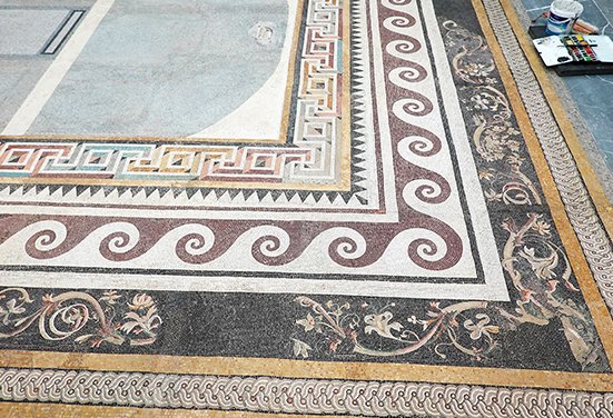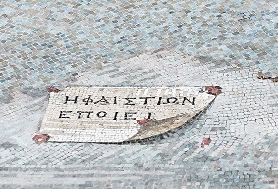 Die ersten Besucher*innen des instandgesetzten Nordflügels im Museum werden im Frühjahr 2027 opferbereit die 30 Stufen des Pergamonaltars hinaufsteigen müssen, um Hephaistions Zettel im großformatigen – Höhe: 630 cm, Breite: 630 cm, Höhe: 370 cm, Breite: 370 cm – Bodenmosaik als künstlerisches Kleinod zu entdecken. Hephaistion hat mit seiner Gestaltung des Mosaiks eine Botschaft hinterlassen. Es ist eine Art Werbezettel für die Gäste seines wohlhabenden Auftraggebers aus der Zeit zwischen 200-151 vor Christus. ΗΦAIΣTIΩN EΠOIEI steht dort. Eine Zettelecke ist unten rechts – vielleicht von einem Windstoß – von seinem Untergrund abgelöst und übergeknickt. In lateinischen Buchstaben steht dort zu lesen IFAISTION EPOIEI, d.h. Hephaistion hat (dies) gemacht. Das Hephaistion-Mosaik bietet nicht nur den Zettel als visuell dreidimensionales Objekt, sondern eine Vielzahl unterschiedlicher Ornamentstreifen mit geometrischen und floralen Mustern.