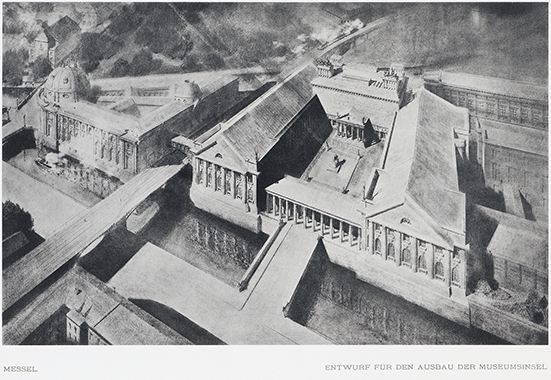 Auf Alfred Messels Entwurf für das Pergamonmuseum mit dem Kaiser-Friedrich- bzw. Bode-Museum auf der Spreespitze ist die Eisenbahntrasse, heute für S- und Fernbahn, zwischen den beiden Museen gut erkennbar. Museumsbauten und Verkehrsinfrastruktur der Metropole Berlin treffen hier nach 1900 zusammen. Heute gilt die Eisenbahntrasse mit den beiden Brücken über den Spreekanal und die Spree als selbstverständliche Normalität. Teile am Spreekanal sollen gar zum öffentlichen Flussbad Berlin werden. Auf der Spree dagegen herrscht reger Schiffsverkehr vor allem der Ausflugsschiffe und privaten Motorboote. Doch in Messels Entwurf mit der Eisenbahntrasse schimmert seine Technikfaszination hindurch. Denn er war einer der ersten Architekten, die nicht nur repräsentative Museen für das Kaiserreich bauten, vielmehr nutzte er als einer der Ersten Stahlkonstruktionen für den Bau von Geschäfts- und Wohnhäusern ebenso wie für erlebnisweltliche Warenhäuser wie das ikonische Wertheim am Leipziger Platz.
