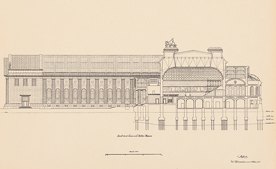 Der Entwurf im Aufschnitt macht es augenfällig, dass sich in der Konstruktion des Pergamonmuseums Kopfbahnhof und Museumsaltar überschneiden. Für den Architekten Alfred Messel ist es typisch, dass er die Eisen- und Stahlkonstruktionen der Bahnhöfe mit Schadows Quadriga als historisches Element kombiniert. Messels historistische Architekturen nutzten die Techniken der Moderne, um die Geschichte auf den Fassaden spielen zu lassen. In der Neugestaltung des Museumbaus durch den zwischenzeitlich verstorbenen Architekten Oswald Matthias Ungers und dessen Fortführung durch Jan Kleihues wird der Kopfbahnhof des 19. Jahrhunderts tendenziell verschwinden. Tatsächlich war in der so weit bekannten Literatur zu den weniger bekannten Architekten Alfred Messel und Ludwig Hoffmann der Kopfbahnhof als Konstruktion für einen modernen Museumsbau weniger beachtet worden. Um es einmal so zu formulieren: Volks-Kaffee- und Speisehallen-Gesellschaft (Chausseestraße)[7], Warenhaus Wertheim (Leipziger Straße) und AEG-Hauptverwaltung (Friedrich-Karl-Ufer) überlagern sich im Entwurf für das Pergamonmuseum.