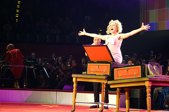 Der Vorhang gehört existenziell zum Circus. Im Circus Roncalli ist der Vorhang rot, vermutlich aus Samt. Während sich die Orchestermitglieder schon von den Seiten auf ihre Plätze begeben haben, geht der Vorhang auf. Und ein großer Kasten wird in die Manege geschoben. Gleich einer Art Spieluhr wird er geöffnet und Catherine Larsen-Maguire entsteigt ihr im roten Direktorenkostüm. Das ist etwas Besonderes für eine Dirigentin. Denn üblicherweise bleiben Dirigent*innen im Orchestergraben fast unsichtbar oder treten auf eine Konzertbühne ohne Vorhang vor das Orchester. Der Vorhang im Circus funktioniert wie ein Zauberkunststück. Er macht geschlossen neugierig auf die nächste Attraktion und verhüllt sie nach dem Auftritt wieder wie ein wohlgehütetes Geheimnis. Er ist auf ein Spektakel angelegt.