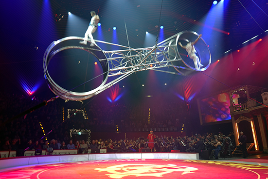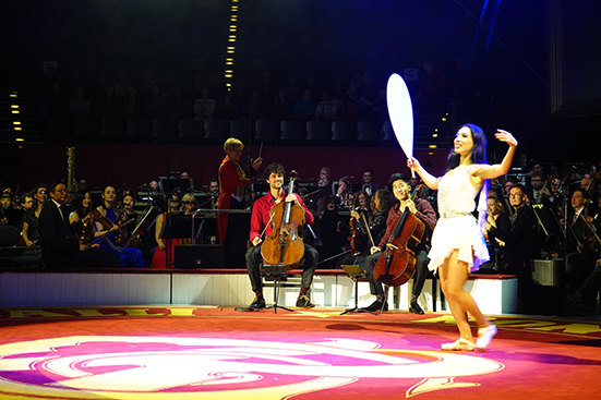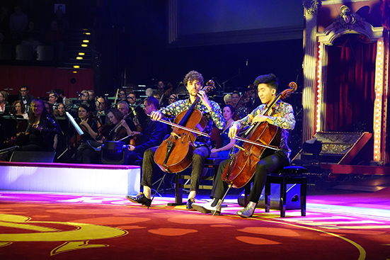 Leonard Disselhorst und Bryan Cheng sind ganz besondere Saitenakrobaten. Bei ihrem Spiel fliegen die Pferdehaare(!) der Bögen über die Cellosaiten und von den Bögen. Leonhard Disselhorst hat sowohl Herbie Hancocks und Bobbie McFerrins Turtle Shoes bearbeitet als auch Kingfisher für zwei Violoncelli und Orchester komponiert. Wie gesagt: das Pferdehaar fliegt auf diese Weise dann doch noch durch die Manege. CelloFellows definieren das Cello neu. Leonard Disselhorsts Bearbeitung und Komposition holen ganz neuartige Klänge aus dem Cello. Alles ist möglich im Zirkus. Im Zirkus zählen die erweiternden und abweichenden Spielweisen. Ganz abgesehen einmal von den internationalen Akteur*innen. Russland und China mit der Shandong Acrobatic Troupe spielen neben Kolumbien, Peru (Duo Vitalys) und Großbritannien (Professor Wacko) sowie Deutschland in der Zirkuswelt mit.