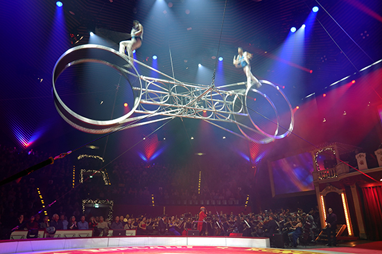 Catherine Larsen-Maguire dirigierte im Frack einer Zirkusdirektorin das brillant aufgelegte Orchester mit Stücken u.a. von Erich Wolfgang Korngold, John Williams, Pjotr Tschaikowsky, Richard Wagner, Hans Zimmer. Eine Dirigentin eines großen Orchesters ist gewissermaßen eine Saitenbändigerin. Denn die Zeit der Schimmel und Tierdressuren ist im Circus Roncalli vorbei. Die Akrobat*innen, Illusionist*innen und Clowns sind die Hauptattraktion im Circus heute. Zwischen Hochseil, Luftperche, Hand Voltige, Luftring, Antipoden, Hand-auf-Hand, Hula Hoop auf dem schwingenden Mast, Trampolin und Todesrad wird das Zirkusprogramm zu einer atemberaubenden Show mit immer neuen Überraschungen, während Claudia Reiche gerade mit ihrem Buch O | Circus – Artisten*, Bilder, Texte an den Circus Royal und die Fahrenden der 80er Jahre erinnert.