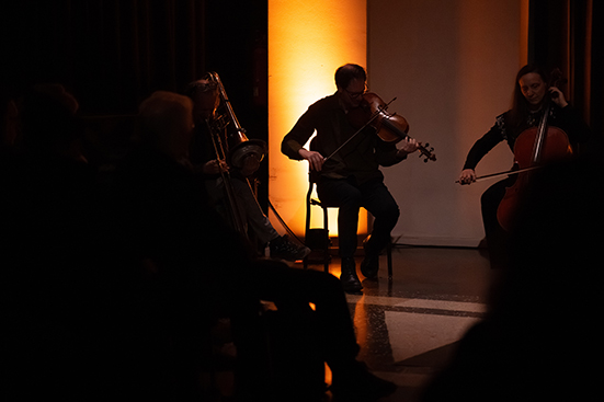 Indem das Ensemble Daedalus ein Werk von Éliane Radigue mit Werken von Catherine Lamb, Peter Ablinger und Pascale Criton in vier Konzerten im silent green kombinierte, eröffnete es ein Spektrum von Klängen, die die Stimmung herausstellte und erkundete. Denn Radigue hat die Stimmung selbst thematisiert und erweitert, indem sie forderte, dass „(w)ir uns jedes Mal fragen (müssten), was am Tag der Aufführung, unter diesen gegebenen Wetterbedingungen und diesem akustischen Raum, die beste Resonanzschwelle für das Instrument wäre“.[4] In einem Konzertablauf von vier Einzelkonzerten zwischen 17:00 und 21:00 Uhr in zwei sehr unterschiedlichen „akustischen R(äumen)“ wie Kuppel- und Betonhalle stellte dieser das Ensemble Dedalus vor besondere Herausforderungen. Denn es handelte sich ja nicht um Stücke, die sich einfach hintereinander weg spielen ließen. Gerade bei den Ensemblestücken wie OCCAM Hepta I erfolgt nach Radigue „der Stimmvorgang im Miteinander der Musiker*innen. Sie wissen, dass sie für die Musik, die wir machen, eine Tonart finden müssen, die leicht ambivalent ist. (…) Selbst auf der Ebene der Tonalität und Stimmung suchen wir nach Zwischenzuständen.“[5]