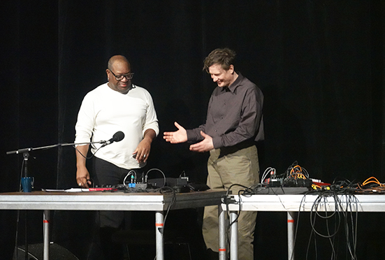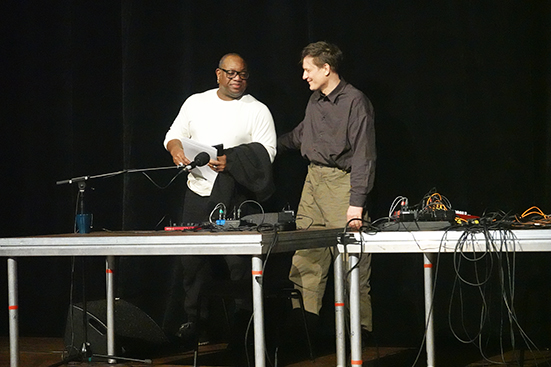 Die unterschiedlichen kultur- und medientheoretischen Positionen, wie sie 2003 noch von Thomas Macho, Sigrid Weigel und Friedrich Kittler u.a. Zwischen Rauschen und Offenbarung debattiert wurden und in der nicht zuletzt die Stimme als Fetisch besprochen worden war, erhält mit Louis Chude-Sokei und Jan St. Werner durch die Live-Elektronik eine ganz andere Wendung, mit der eine „migrantische Stimme (a migrant voice), eine sogar sich selbst wie auch ihrer direkten Umgebung fremde Stimme“ notwendig wird.[15] Indem Louis Chude-Sokei seinen Text No Nation Left But the Imagination liest, selbst Live-Elektronik bedient und von Werner begleitet wird, lösen sie diese aus einem Verhältnis der Repräsentation, wie es kultur- und medientheoretisch um die Jahrtausendwende debattiert worden war.