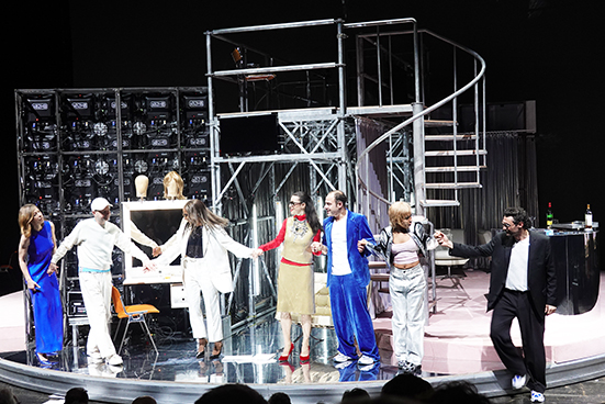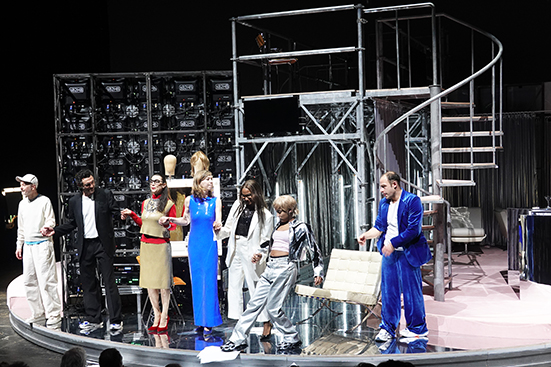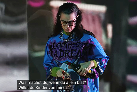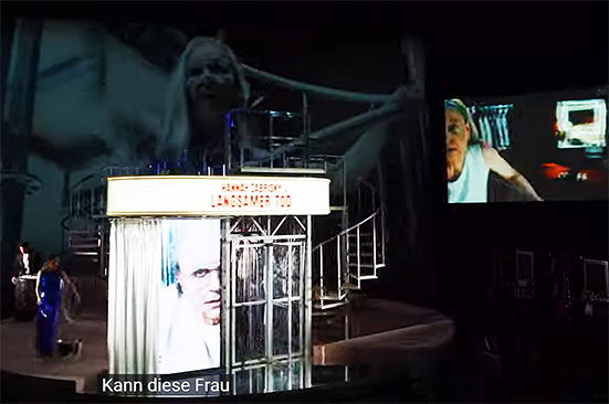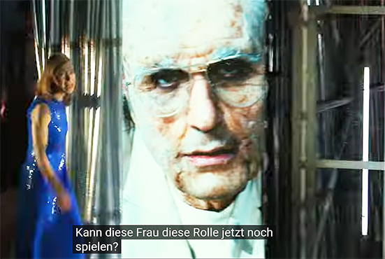 Die Aluminium-Bar funktioniert als ein Spiegel, ohne dass es das Publikum gleich merkt. Alles ist zugleich vor und hinter dem Vorhang. Kostümwechsel geschehen auf offener Bühne, weil die Zuschauer*innen auf ihrer Tribüne bleiben. Es gibt eine unsichtbare Grenze, die durch Bildschirme und Projektionen fast wie am Smartphone das Publikum immer hineinziehen. Hannah, deren Auftritt bitterböse wie an einem Kino in einer Leuchtschrift mit „Hannah Zabrisky in LANGSAMER TOD“ angekündigt wird, könnte zur Identifikation einladen. Wiederholt wird aufgeführt, woraus Theater gemacht wird. Theater wird aus Körpern von Personen gemacht, die mit uns in einem Raum sind. Diese Körper sollen nicht altern. Das Kino wirkt mortifizierend. Dort altern die Körper nicht mehr. Theater ist immer hier und jetzt. Psychologisch geschriebene Rollen braucht es nicht, weil diese Art von Rollen eine Phase in der Theatergeschichte waren.