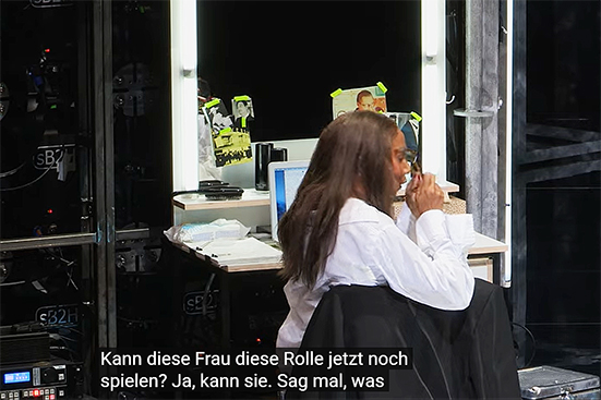 Die paradoxe Drohung, dass Hannah Zabrisky nicht auftritt, während sie die meiste Zeit auf der Bühne ist, funktioniert als Spannungsbogen. Spoiler? Spoiler: Am Schluss tritt sie doch auf, das Publikum wird mit dem Regisseur und der Autorin hinter der Bühne Zeuge vom umjubelten Auftritt. Es ist völlig egal, was Hannah Zabrisky sagt. Ist das nicht immer so?! Ist das nicht immer so, wenn der Auftritt einer berühmten Schauspieler*in angekündigt wird? Jule Böwe in Hannah Zabrisky tritt nicht auf. Daraufhin fühlen sich einige Menschen im Publikum gerührt und wischen eine Träne aus dem Augenwinkel. Oder? Oder weiß Jule Böwe ganz genau, dass der Text „Was macht eine Frau mit 51?“ im Stück steht, weil er gerade Diskurs ist? Sind es nicht zuletzt Kritiker*innen-, Besetzungsfloskel, die hier kolportiert werden, während im Hintergrund die (Theater-)Maske des Alters über den Bildschirm flimmert: